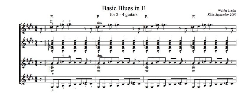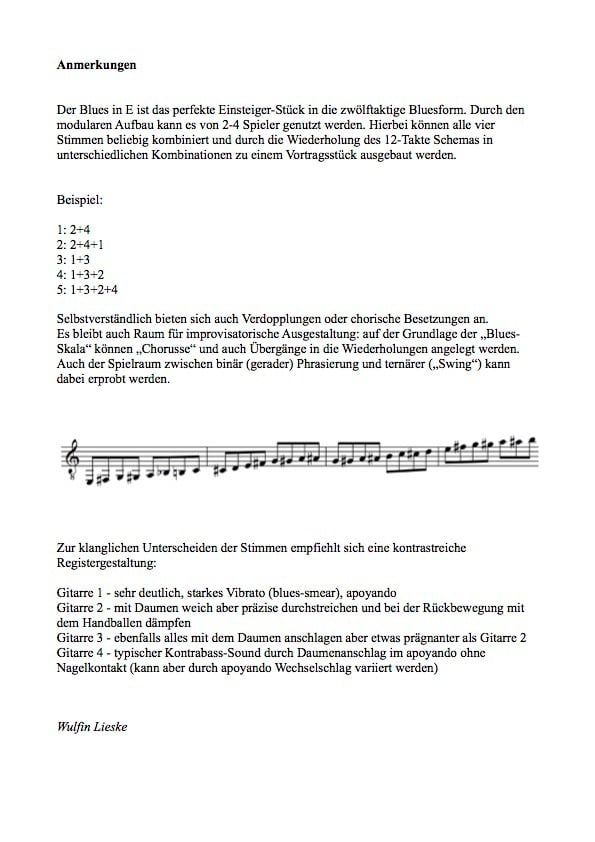 Der Einsteiger-Blues - für zwei bis vier Gitarristen, vielseitig kombinierbar, technisch leicht mit allen Grundtechniken von Melodie-, Akkord- und Daumenanschlag. Mit optionaler Chorus-Improvisation
